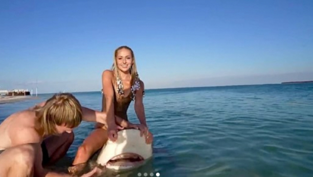 Na snimku se vidi kako ona i njeni prijatelji love ajkulu na nepoznatoj lokaciji, a zatim je izvlače do plićaka. Natali je prva sedela na leđima morskog predatora i slikala se, izražavajući oduševljenje.