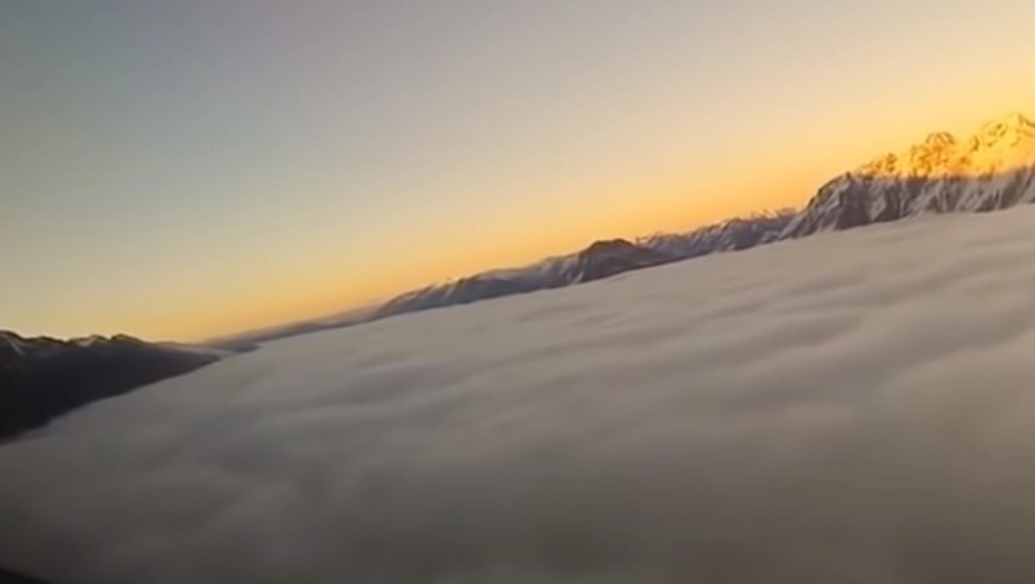 Na snimku se vidi kako avion leti iznad oblaka, okružen planinskim vrhovima.