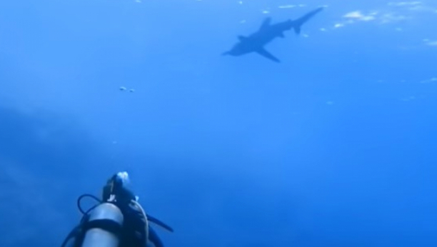 Na snimku se vidi grupa ronilaca koja privlači pažnju ajkula, što dovodi do promene ponašanja ovih morskih predatora.