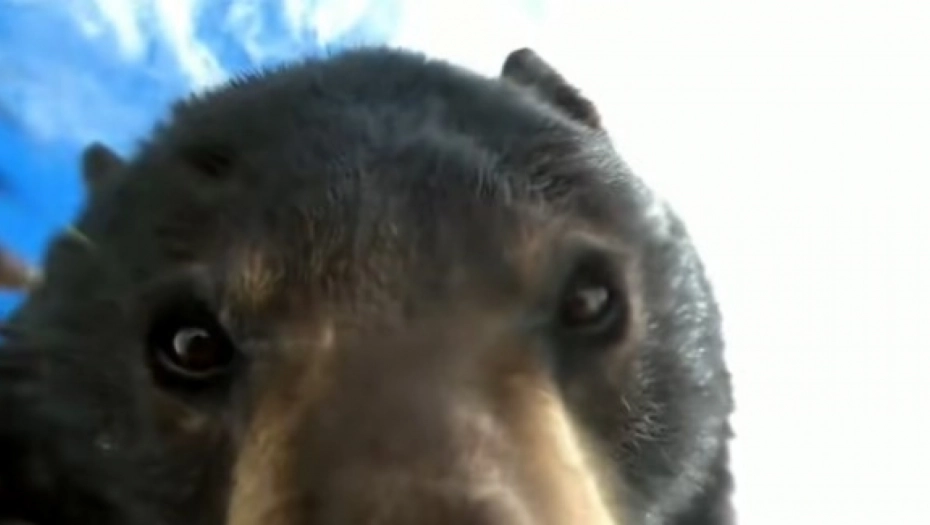 Na snimku se vidi kako medved nosi kameru u ustima, igra se s njom i čak okreće objektiv prema sebi.