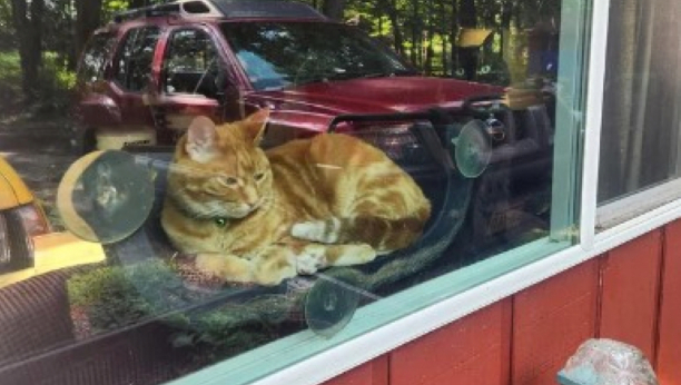 Na slici je prikazana riđa mačka koja sedi pored prozora i gleda napolje. Tu je i jedno crveno terensko vozilo parkirano na prilazu, koje se nalazi u odrazu izloga.