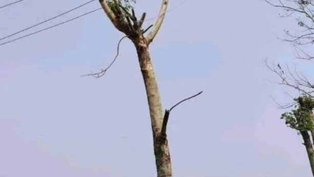 Na snimku se jasno vidi kako je neko očigledno odlučio da unese malo prirode u elektrifikaciju. Pitanje je samo – kome je palo na pamet da umesto betonske bandere upotrebi granu drveta? Možda su se setili da je drvo ekološki prihvatljivije ili su jednostavno želeli da od struje naprave pravi „plod prirode“.