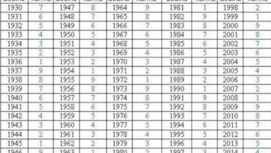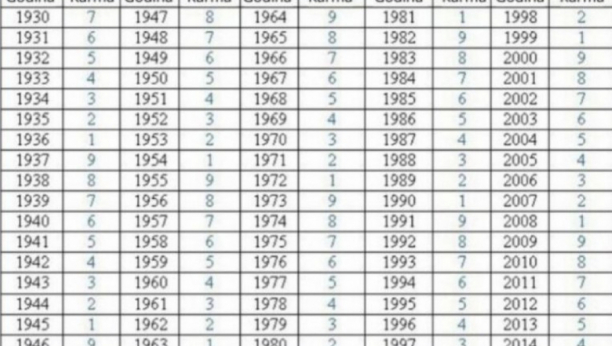 Veruje se da svaka godina rođenja nosi posebnu karmu, ali i da može da pokaže u kojoj ste fazi reinkarnacije. U tabeli pronađite godinu svog rođenja, a pored nje je napisan broj vaše karme, koji otkriva kakva vas karma prati tokom života, kako možete da je ispravite i poboljšate...