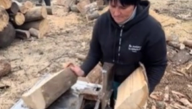 Na snimku se vidi žena srednjih godina koja hrabro i vešto cepa velike komade drva, dok dvojica muškaraca u pozadini seku drva motornim testerama.