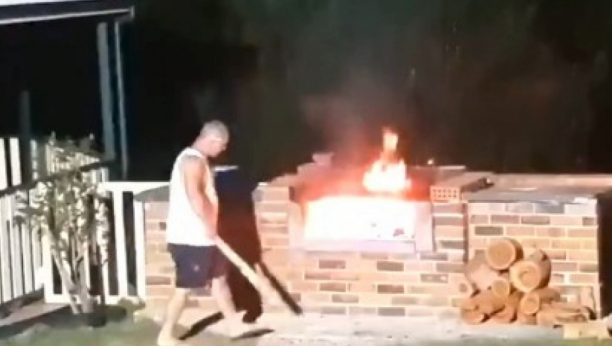 Na snimku se vidi muškarac koji je umalo nastradao dok je na već užaren roštilj bacio gomilu tzv. raspaljivača za vatru.