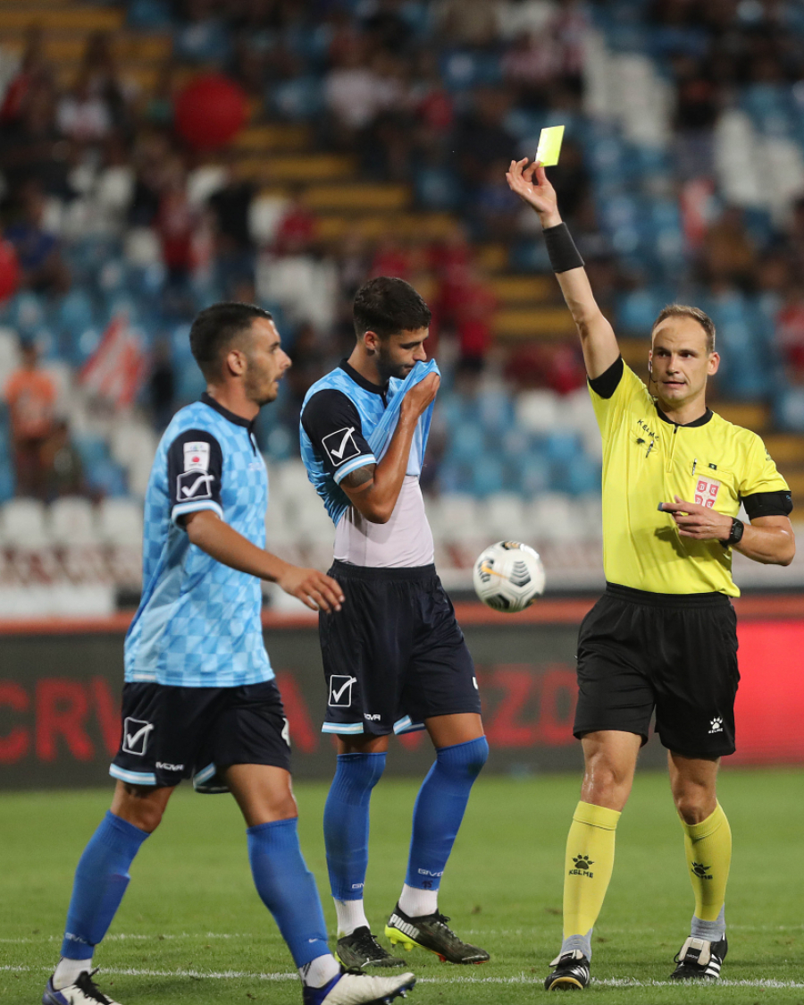 82. minut: Koškanje na sredini terena, požuteo je igrač gostiju Marinković.