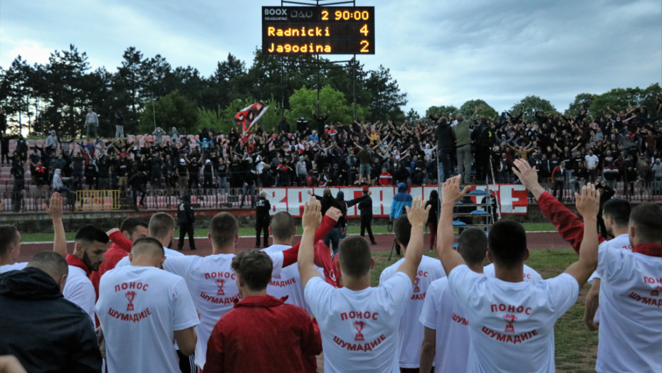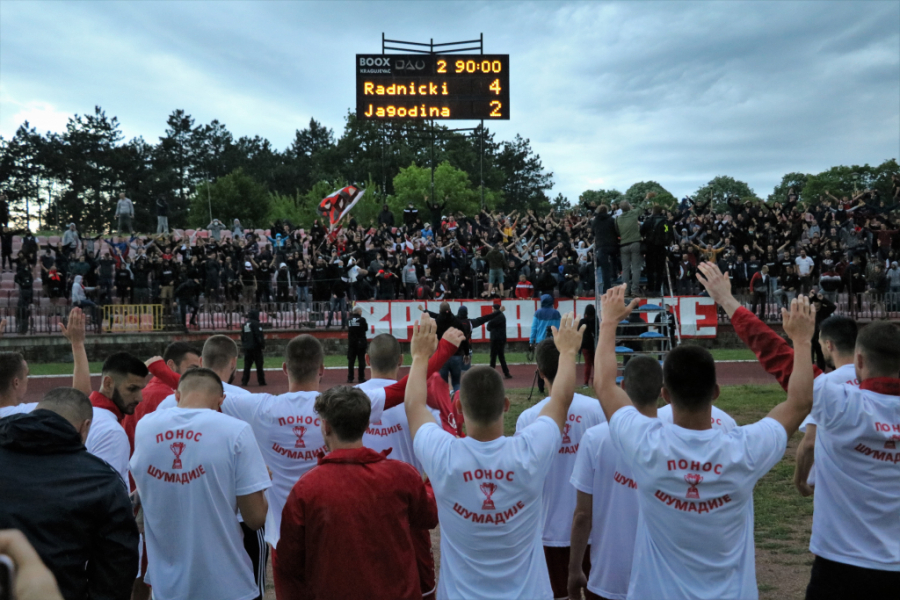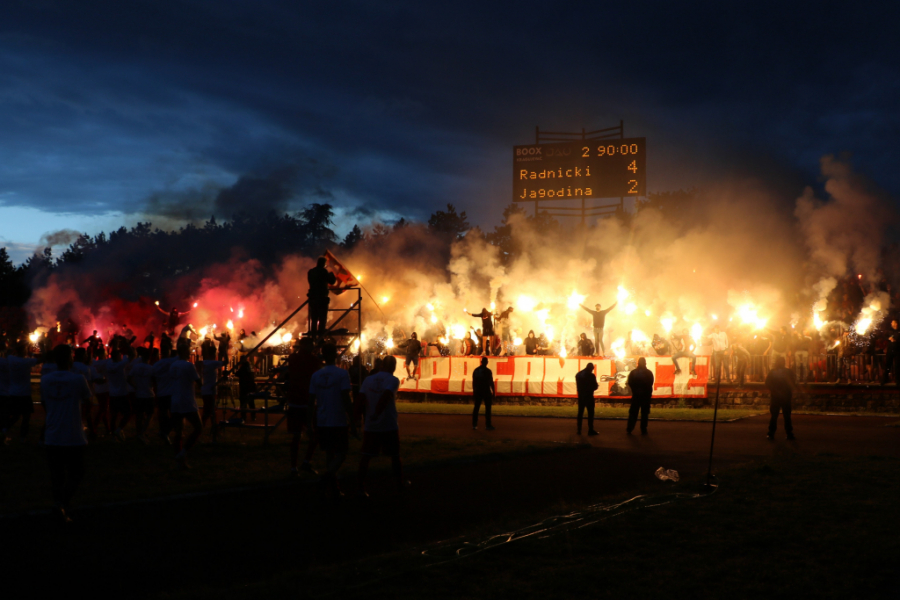 Uz ulazak „crvenih đavola“, najvatrenijih navijača Radničkog 1923, na južnu tribinu stadiona „Čika Dača“, po završetku meča protiv Jagodine, Kragujevčani su proslavili plasman u elitni rang našeg elitnog fudbalskog takmičenja, ali i osvajanje prvog mesta, koje su dugo držali, a koje su nizom loših igara doveli u pitanje.