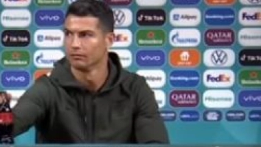 Čim je seo na svoje mesto Ronaldo je odmah pomerio flašice gaziranog pića koja je jedna od glavnih sponzora Evropskog prvenstva.