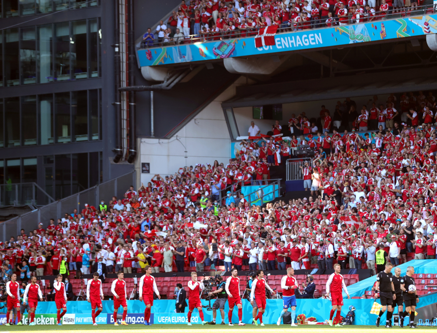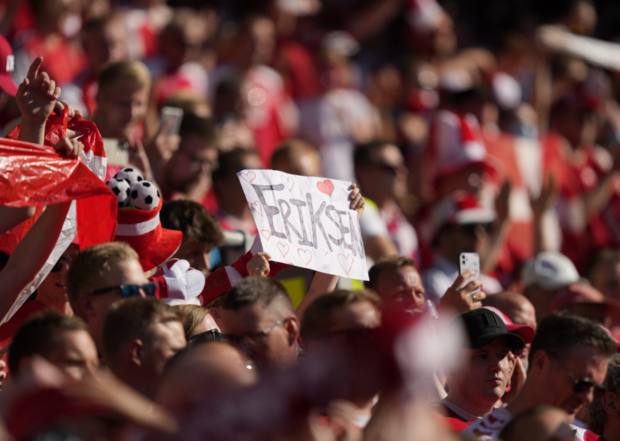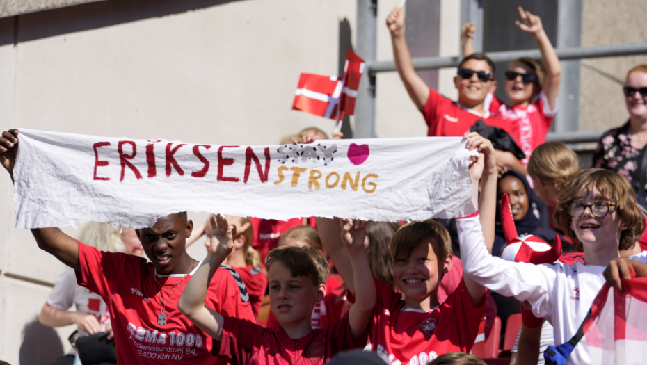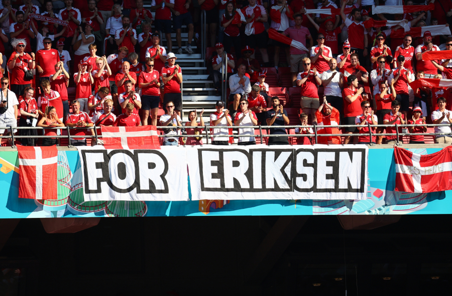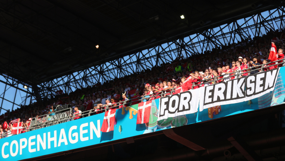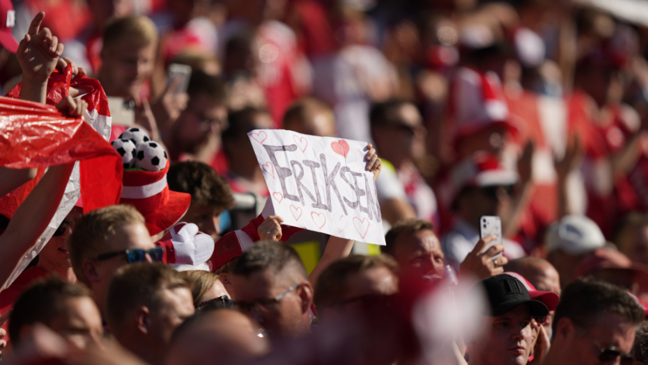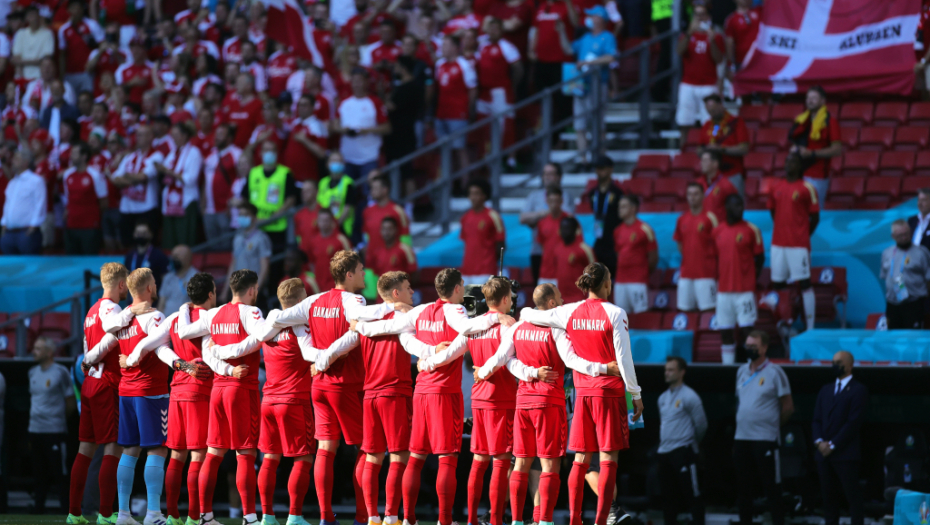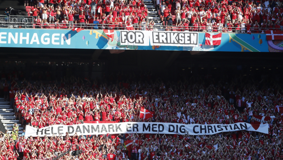 10. minut: Lopta je stala kraj aut linije, svi su stali, sve je inicirao Romelu Lukaku kako bi se njegovom saigraču iz Intera uputila podrška, pošto Kristijan Eriksen na dresu nosi broj 10. Navijači su istakli transparente podrške - "cela Danska je uz tebe Kristijane", aplaudirao je ceo stadion, pa i sudija Kuipers nije mogao da ostane imun, pridružio se igračima na terenu.