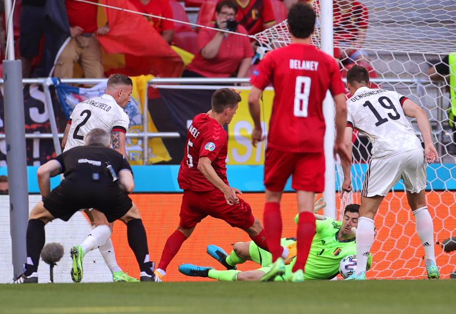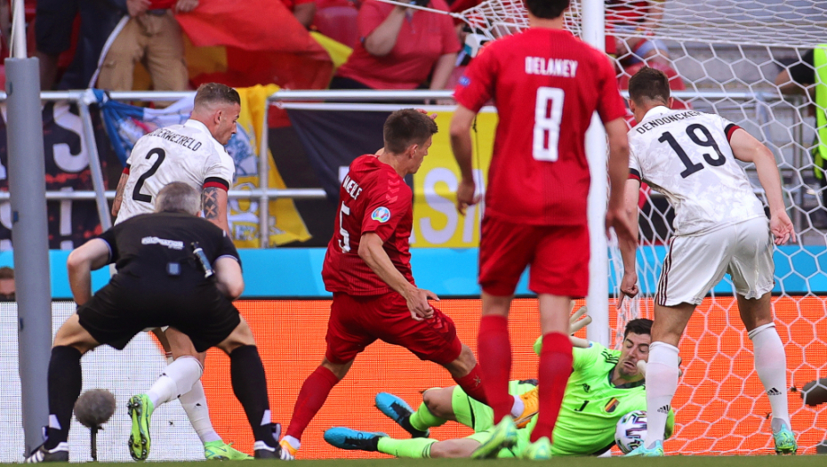 90+5. minut: Golman Danske Šmajhel je krenuo u napad, gol je ostao prazan, Belgija je došla do lopte, Munie je probao da šutira na prazan gol sa 40 metara, ali se igrač Danske bacio i sprečio gol.