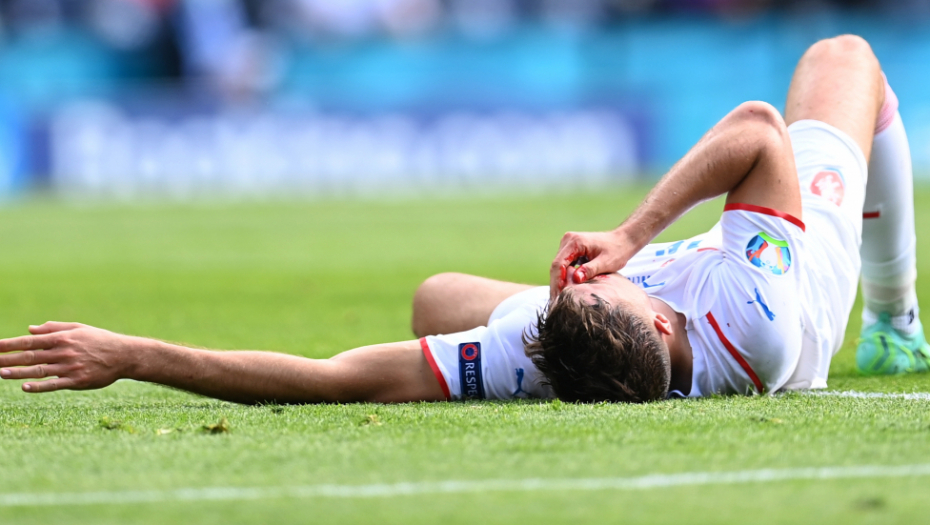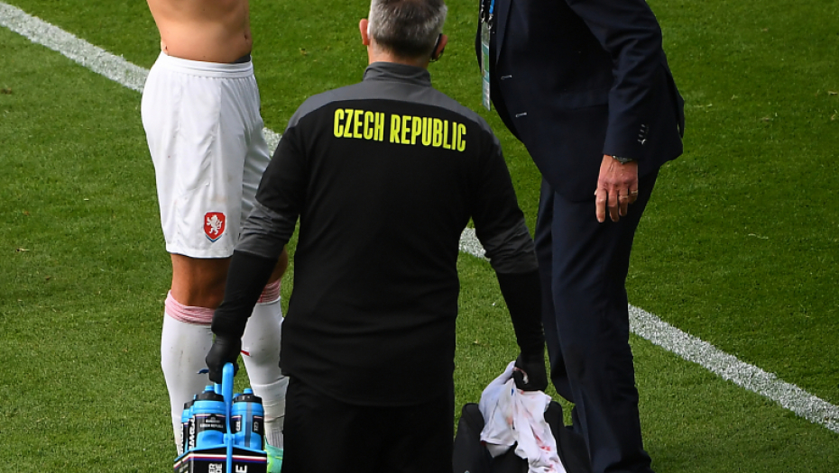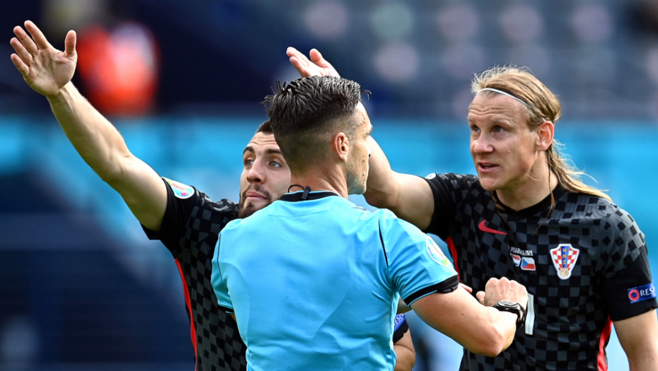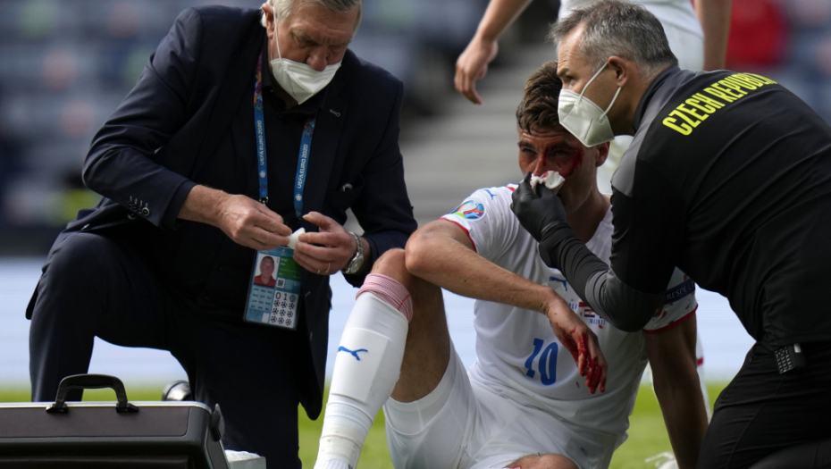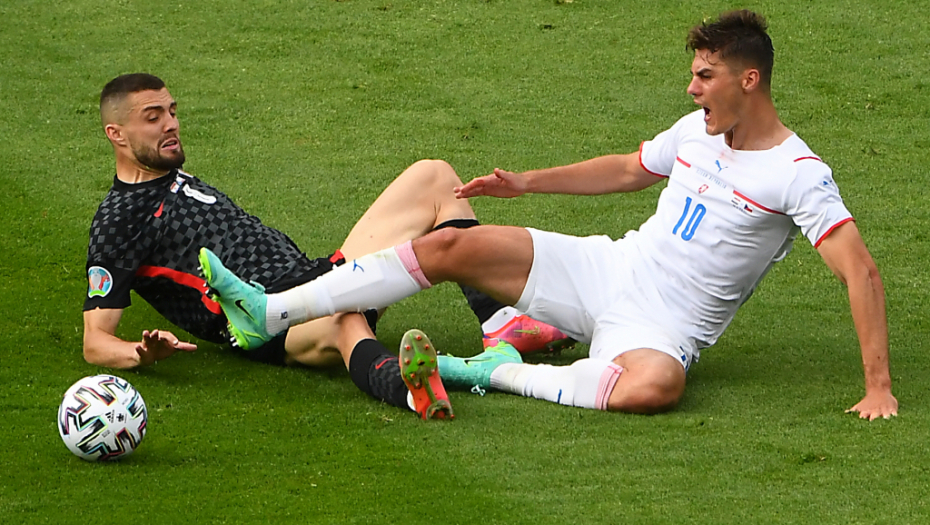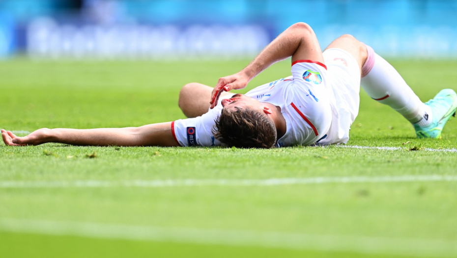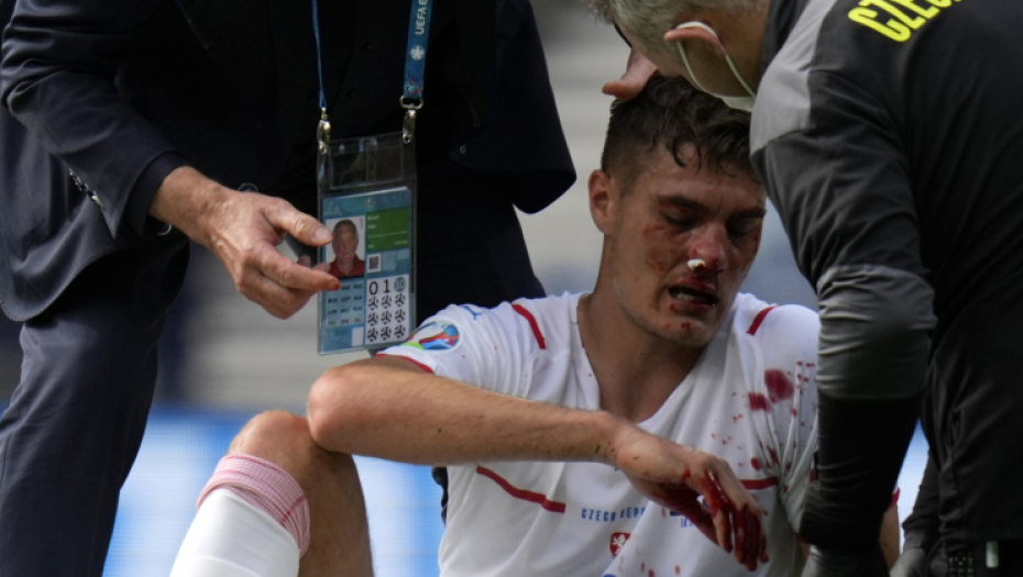 32. minut: Posle kornera u kaznenom Hrvata je ostao da leži i krvari Patrik Šik, Dejan Lovren mu je laktom razbio nos.