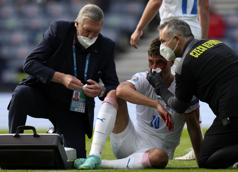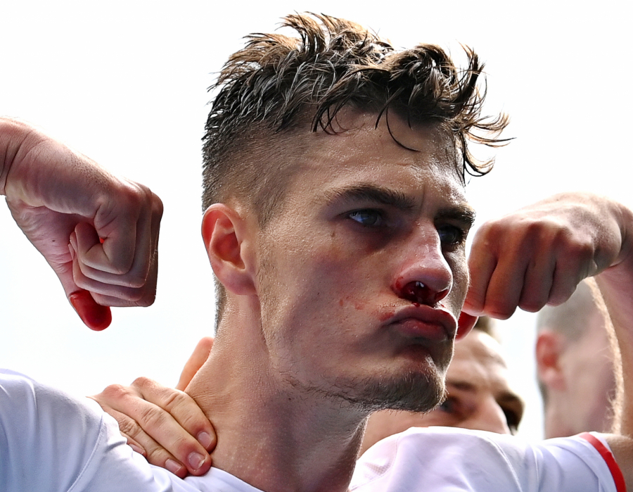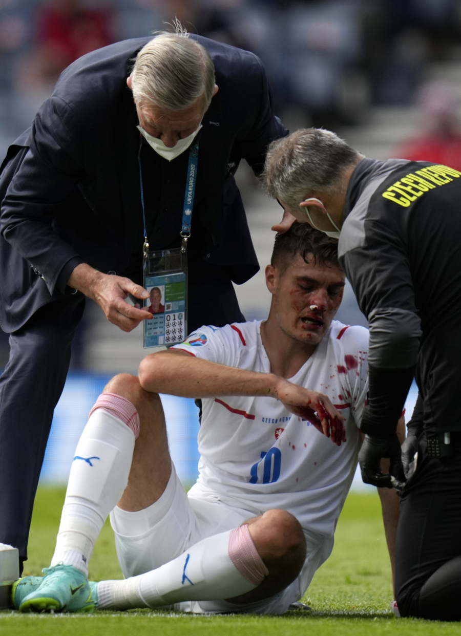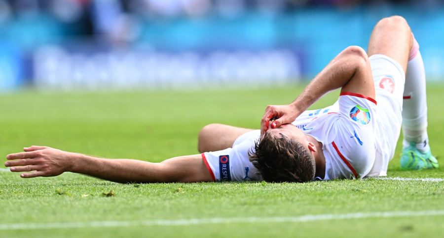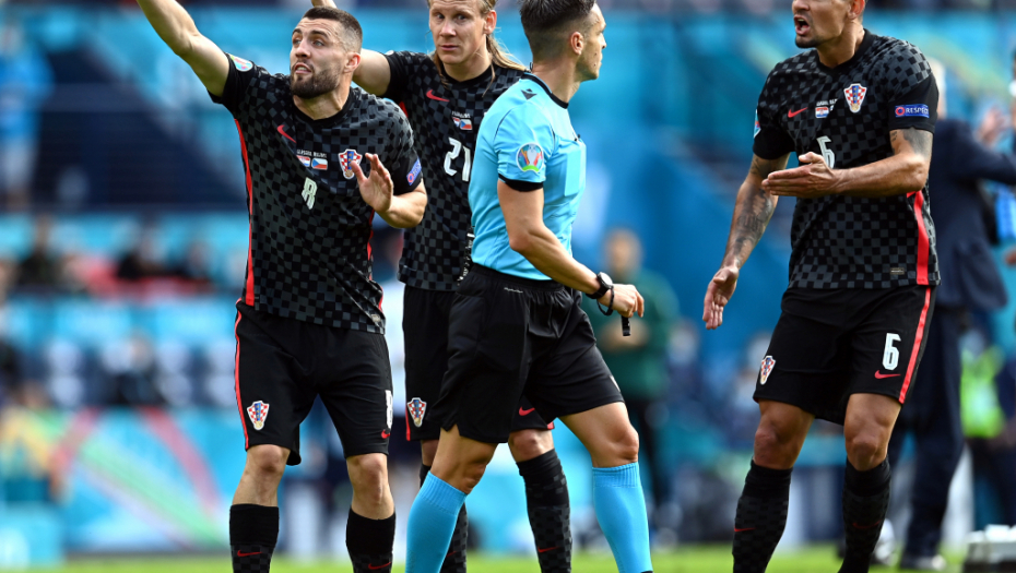 32. minut: Posle kornera u kaznenom Hrvata je ostao da leži i krvari Patrik Šik, Dejan Lovren mu je laktom razbio nos.