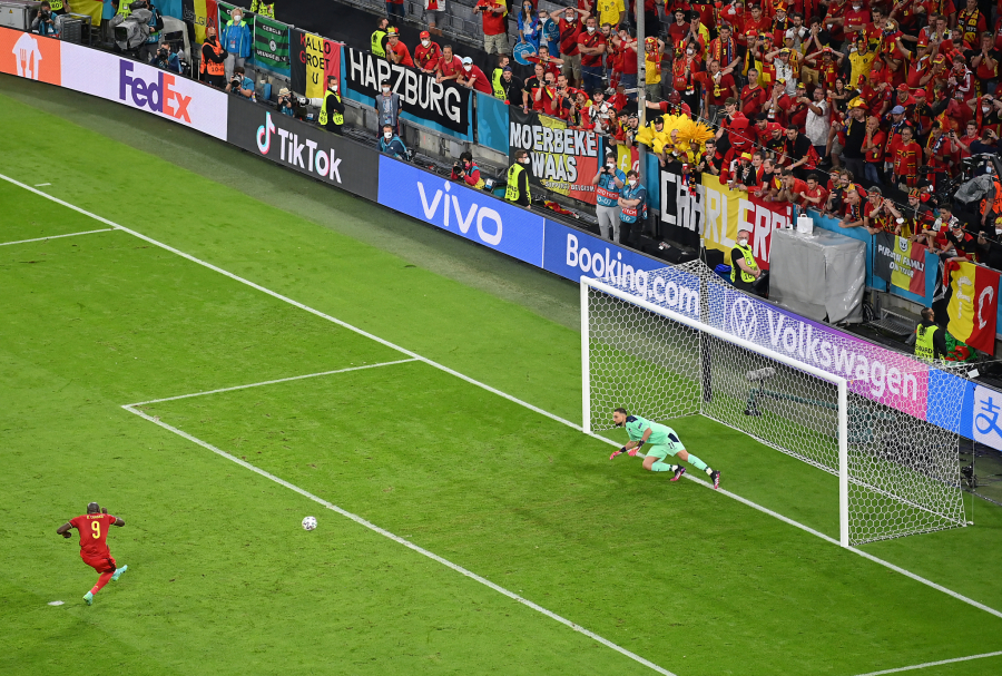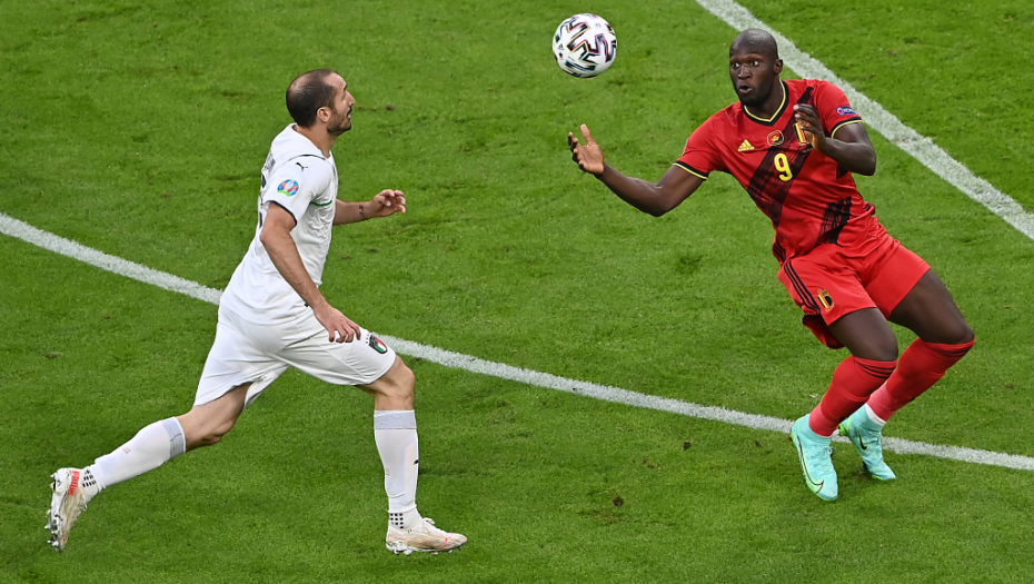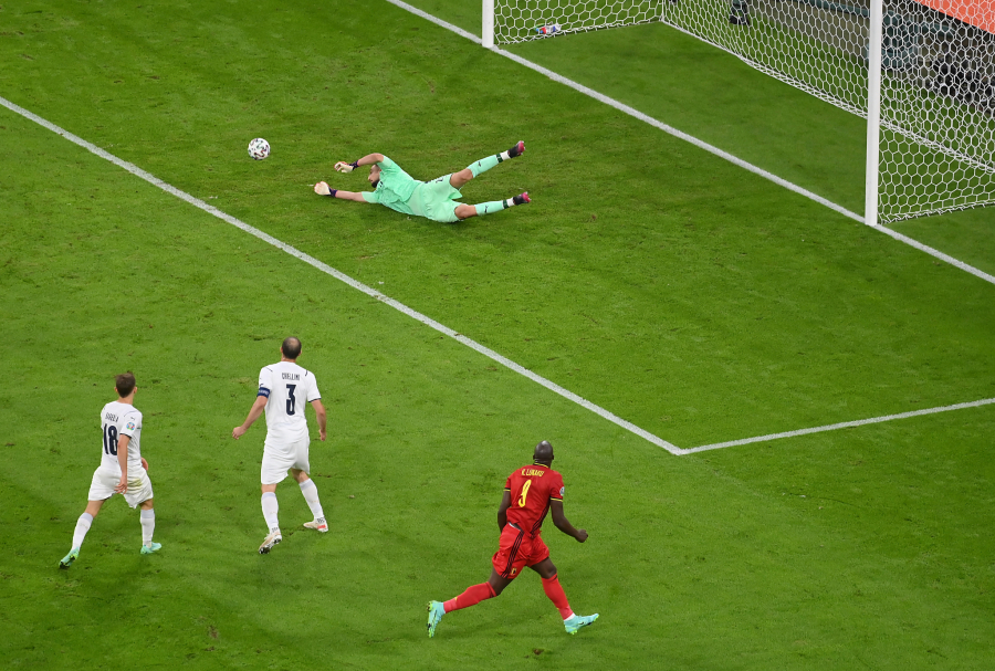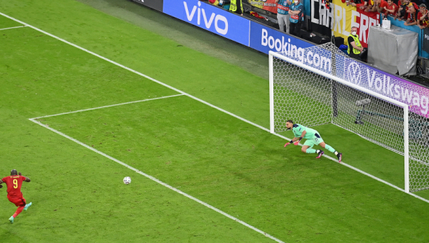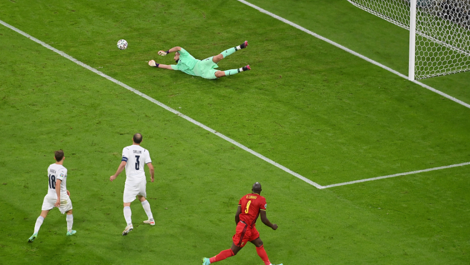 45+2. minut: Romelu Lukaku siguran sa kreča, njegov 64. gol na 98. utakmici, Belgija - Italija 1:2.