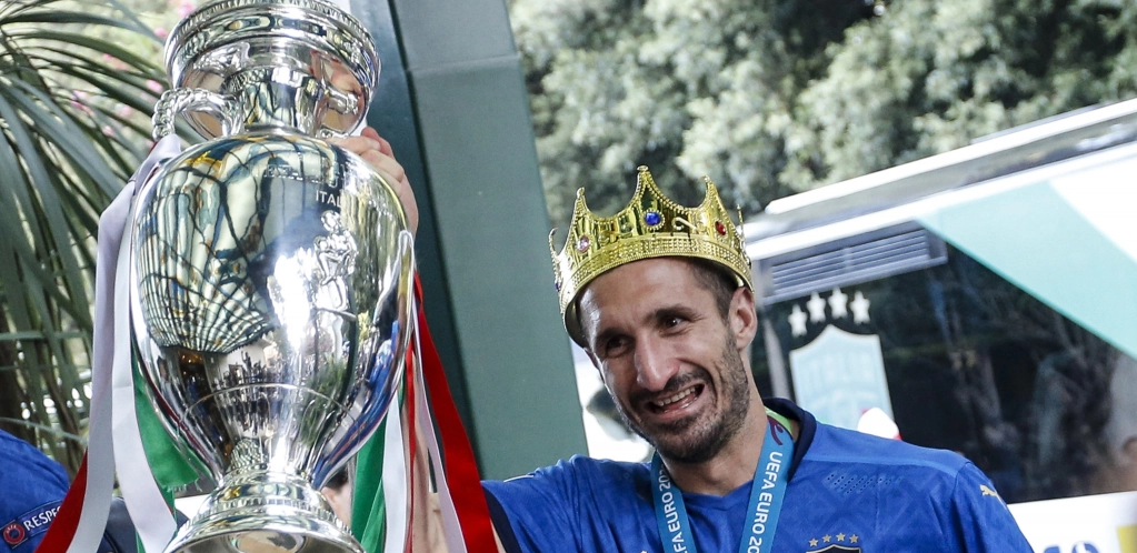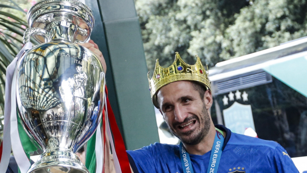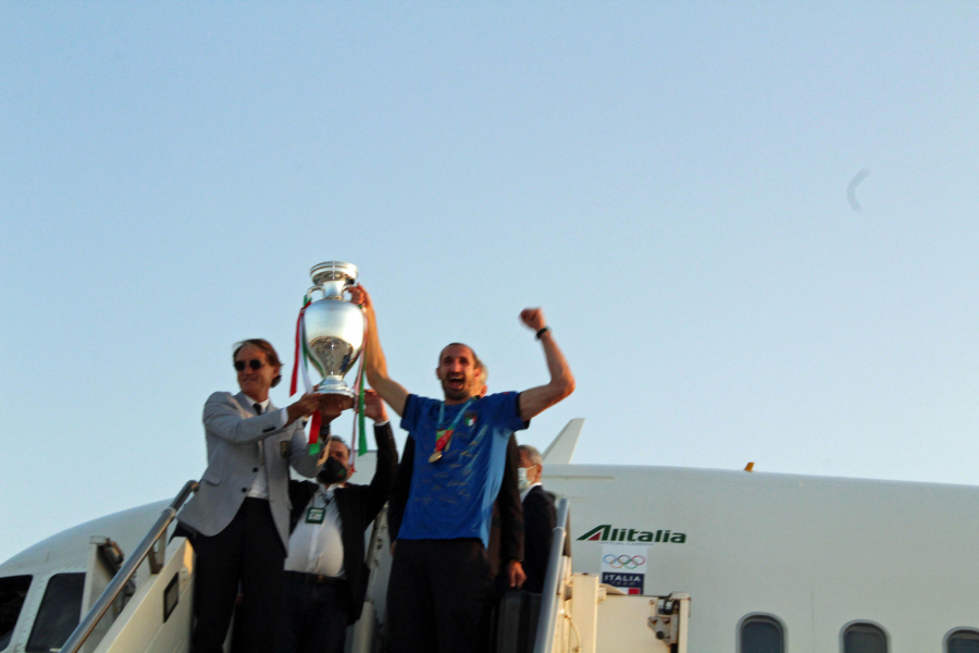 Kapiten Đorđo Kjelini, s podignutom pesnicom, i selektor Roberto Manćini podigli su trofej visoko iznad glava dok su izlazili iz aviona na rimskom aerodromu Leonardo da Vinči.