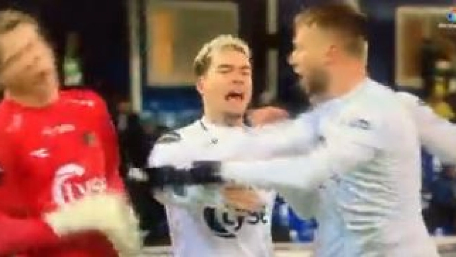 Slovenački fudbaler David Brekalo (22) koji igra za Viking pokušao je fizički da se obračuna sa Patrikom Gunarsonom (21), golmanom njegovog tima.