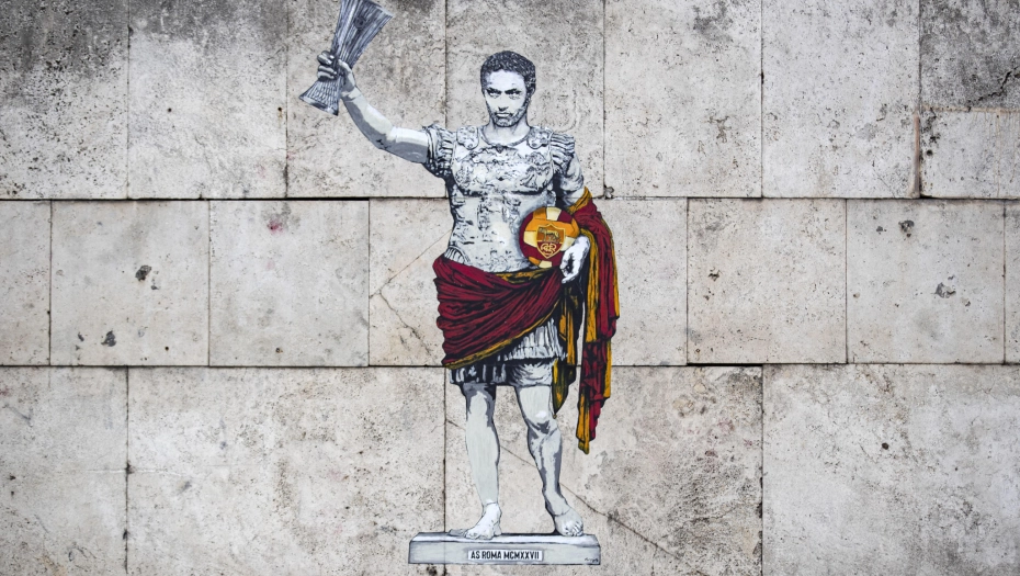 Murinjo je na tom muralu predstavljem kao rimski car koji nosi oklop i togu. A u desnoj ruci nosi trofej Lige Konferencija koji je sa Romom osvojio u sredu uveče u Tirani.