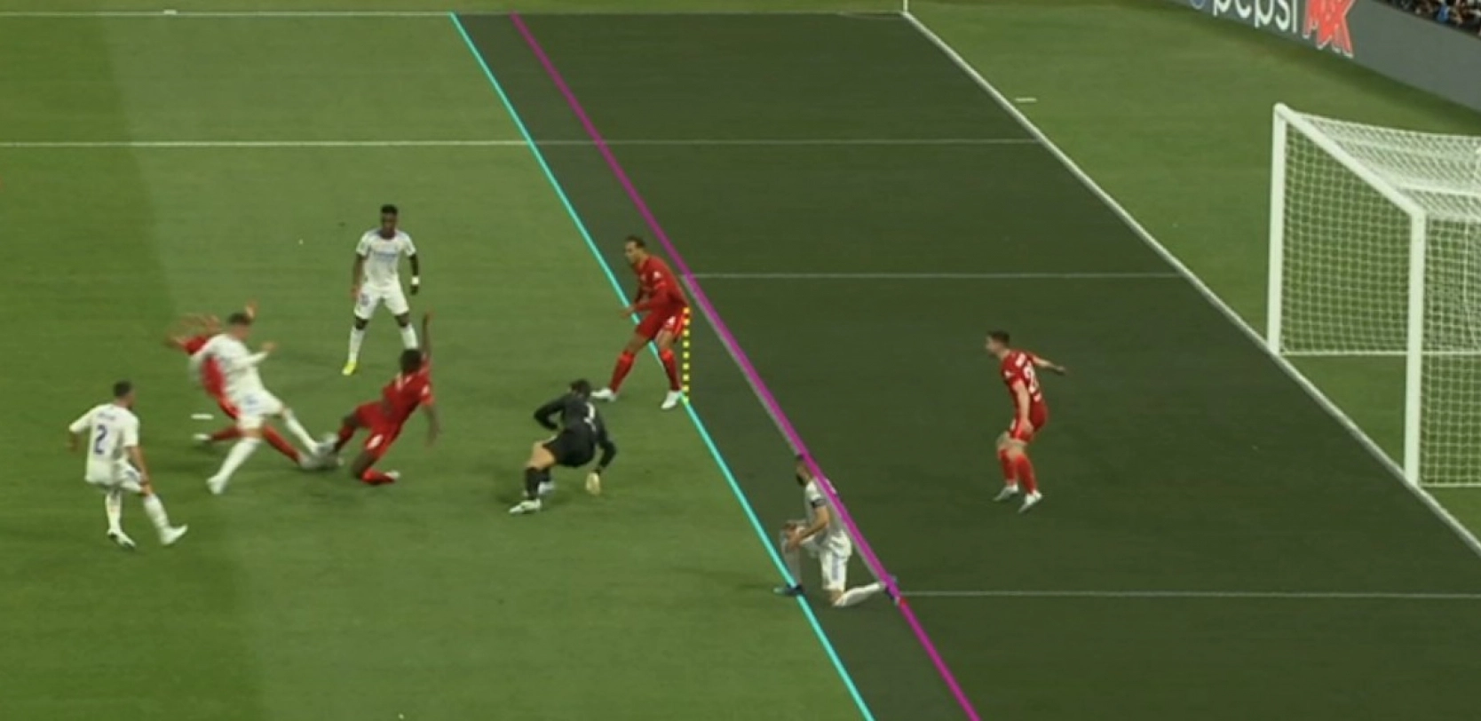 Po pravilu, kada je golman ispred svojih igrača, on se ne gleda već se gledaju isključivo fudbaleri, a potrebno je da Benzema bude ispred dva igrača, što ovog puta nije slučaj jer su iza njega ostali Van Dajk i Robertson.