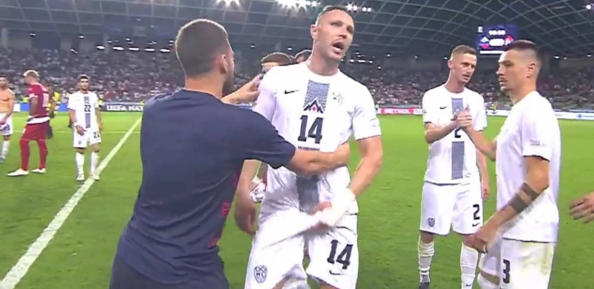 Reprezentativac Slovenije Jasmin Kurtić hvatao se za međunožje nakon utakmice u Ljubljani protiv Srbije, što su gotovo svi shvatili kao gestikulaciju navijačima "orlova" kojih je bilo u velikom broju.