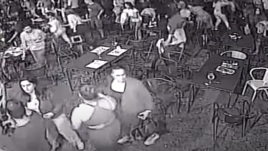 Na objavljenim snimcima vide se ljudi kako ustaju i beže iz kafića dok grupa zamaskiranih, većinom obučenih u crno navijača, nasrće bacajući stolice i baklje.