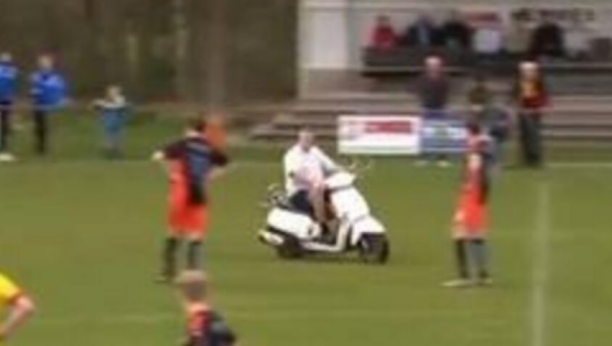 Naime, meč je u jednom trenutku morao da se prekine jer je muškarac srednjih godinama uleteo na teren, i to prevoznim sredstvom, odnosno skuterom.