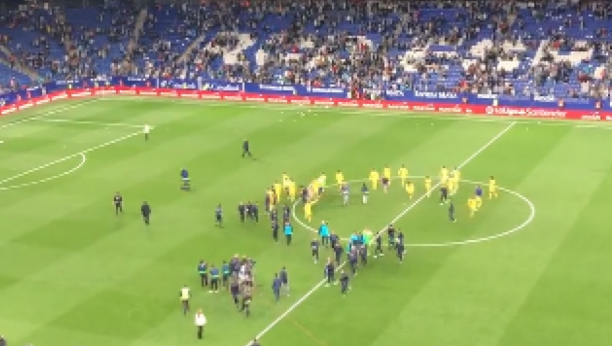 Navijači Espanjola su maskirani uleteli u teren i počeli da jure fudbalere Barse. Kad su ih ugledali, novi prvaci Primere potrčali su ka svlačionici, u kojoj će nastaviti slavlje.