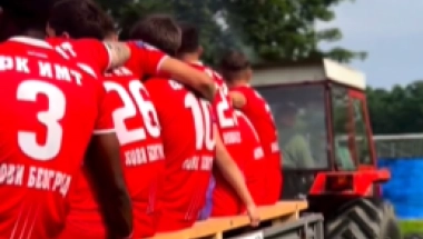 Fudbalski klub IMT na urnebesan način obeležio je istorijski uspeh i ulazak u Superligu Srbije.