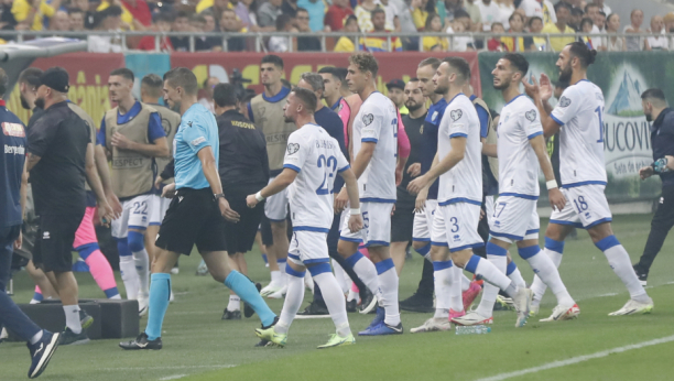 Navijači Rumunije istakli su transparent na kojem je pisalo "Kosovo je Srbija", a te reči su i skandirali zbog čega je utakmica prekinuta na blizu 50 minuta.