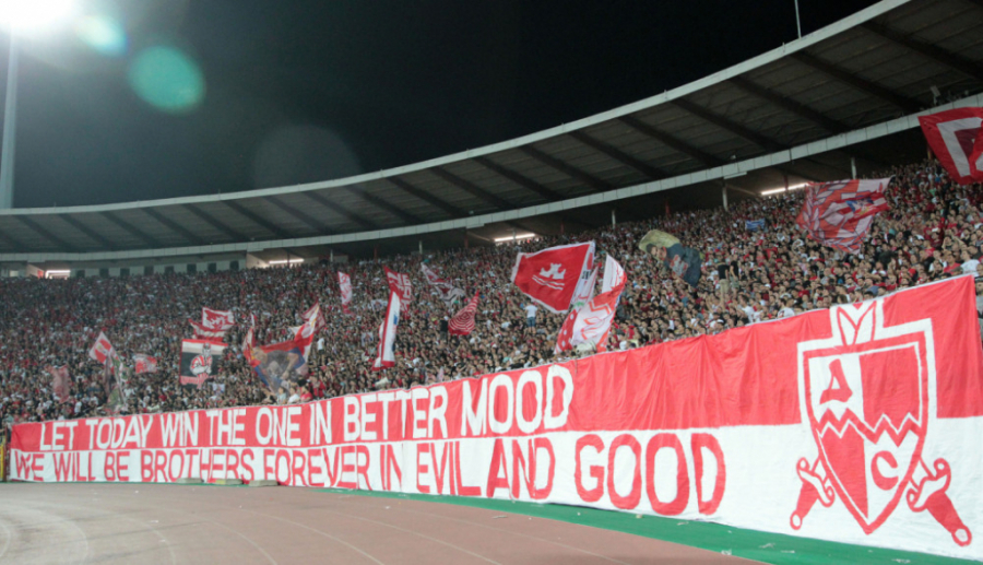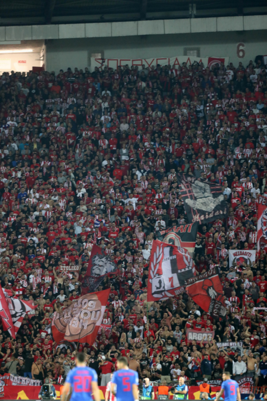 20:35 Neverovatna scena. Sa severa grmi - "Olimpijakos!", Grci sa juga uzvraćaju i pevaju Zvezdi.