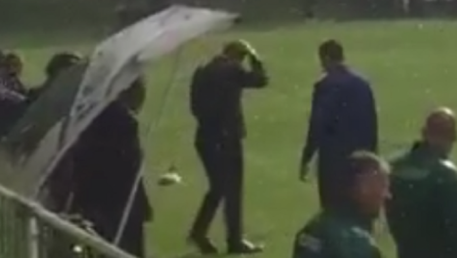 Užasno vreme ne smeta Dejanu Stankoviću. Trener Crvene zvezde je toliko koncentrisan na vođenje tima da se ne obazire na to što kisne, ne krije se na klupi, već ponosno stoji i vodi ekipu.