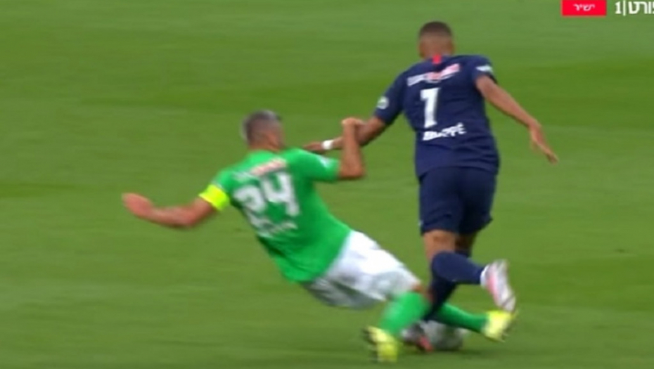 Fudbaler Sent Etjena Loik Peran je u 27. minutu oštro startovao na Mbapea, koji je odmah pao na travu i uhvatio se za nogu.