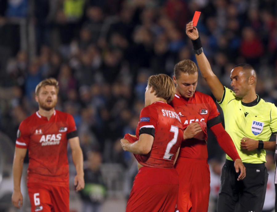 Kraj meča. Partizan je odigrao 2:2 sa AZ Alkmarom u meču prvog kola grupne faze Lige Evrope. Ipak razočaravajući rezultat budući da su crno-beli u većem delu meča imali igrača više.