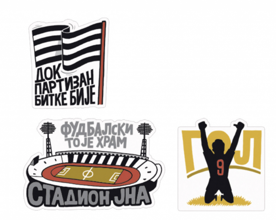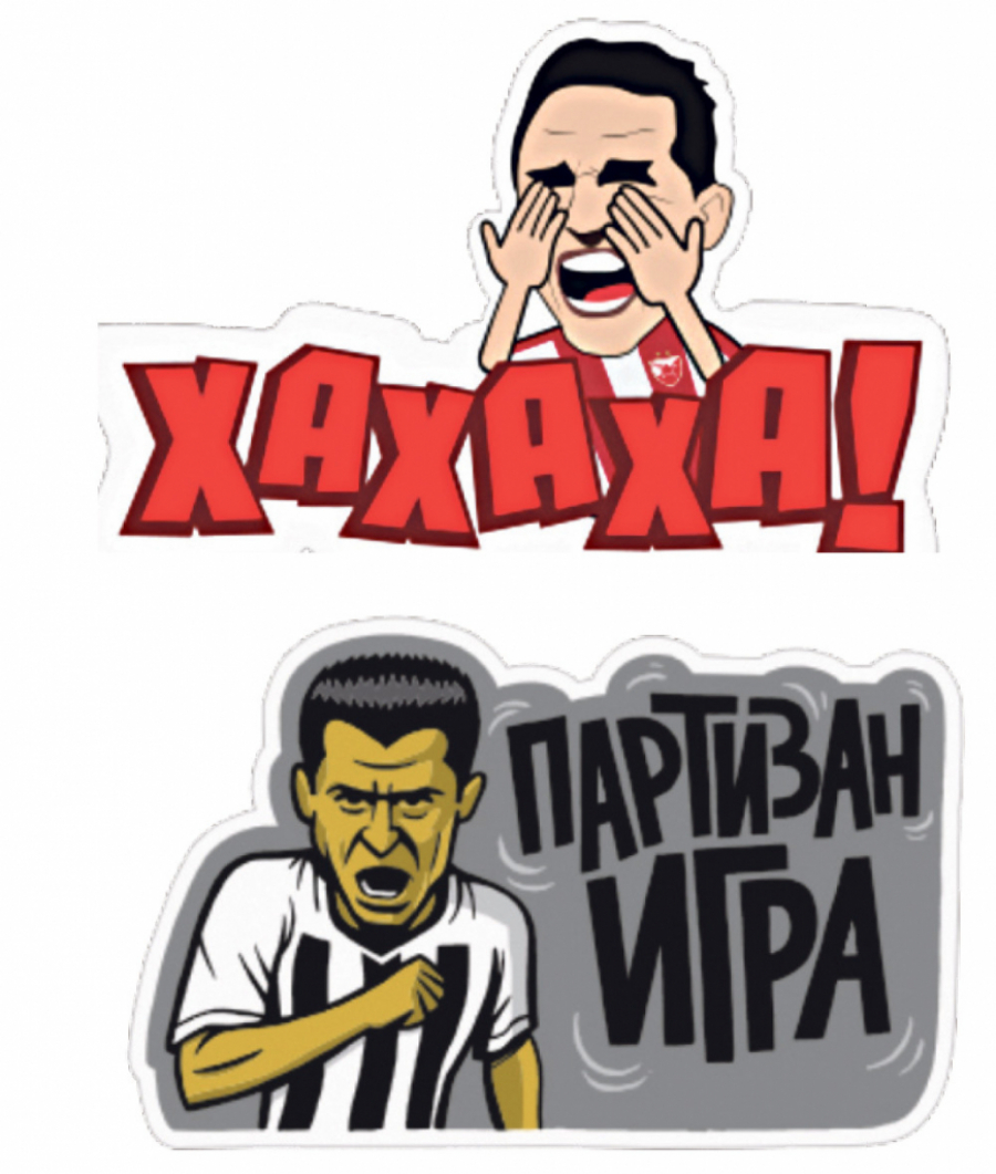 Najčešći stiker koji šalju navijači Crvene zvezde je onaj na kome trener Miodrag Grof Božović pozdravlja palcem nagore. Navijači upravo preko Miše i Grofa peckaju suparnički tabor. „Grobari“ proslavljaju golove uz antologijsko klečanje pokojnog Dragana Mancea, na stadion pozivaju prijatelje uz Sašu Iića, koji šalje poruku „Partizan igra“, kad žele da pokažu koliko su jaki, u poruci nalepe „parni valjak“. „Delije“ imaju stiker koji drugi nikad neće imati - pehar Kupa šampiona, viđanje na utakmicama najavljuju sa „Marakana, rođaci“, a ljubav izjavljuju grbom u srcu.
