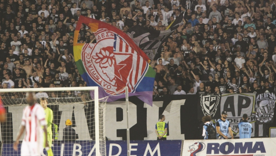- Zastava "duginih boja", zaštitni znak LGBT populacije, sa grbovima Zvezde i Olimpijakosa viđena je na južnoj trbini. Ovo se smatra provokacijom koja se dovodi u vezu sa vređanjem na rasnoj, verskoj ili seksualnoj osnovi. Kod UEFA takođe - nulta tolerancija.