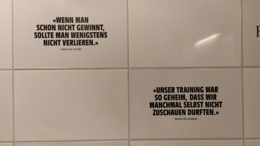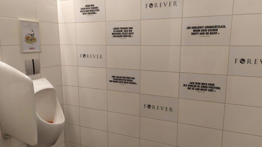 Na "Stadionu Švajcarska", u koji je uloženo preko 300 miliona evra, sve je tip-top. A u toaletu, iznenađenje... Na pločicama, pokraj pisoara, nalaze se reči poznatih trenera kao što je Memet Šol ali i nekadašnjeg selektora Francuske Remona Domeneka i mnogih drugih.