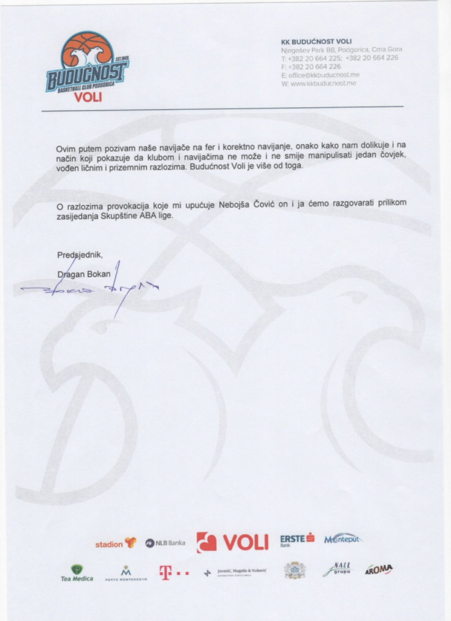 Imajući u vidu da smo prošle godine bili izloženi medijskoj hajci, prozivkama, neosnovanim optužbama raznim vidovima pritisaka iza kojih stoji Nebojša Čović, obratili smo se ABA ligi, smatrajući da je u velikoj meri odgovorna kada su ova dešavanja u pitanju, time što prošlogodišnje ponašanje, iznošenje neistina i govor mržnje nisu adekvatno kažnjeni. To se ne sme tolerisati ni Nebojši Čoviću, ni Draganu Bokanu, niti bilo kome od predsjednika klubova.