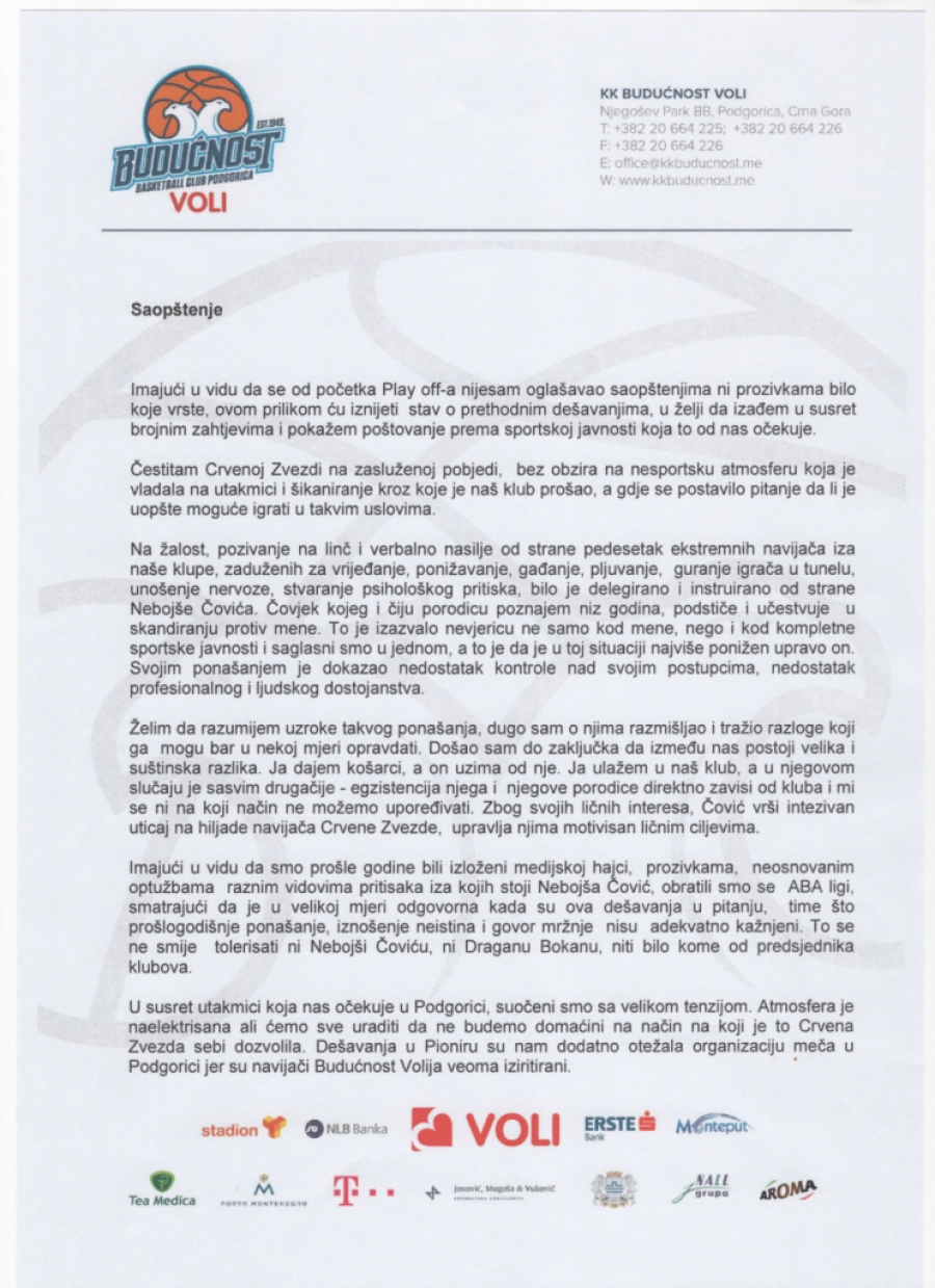U susret utakmici koja nas očekuje u Podgorici, suočeni smo sa velikom tenzijom. Atmosfera je naelektrisana ali ćemo sve uraditi da ne budemo domaćini na način na koji je to Crvena Zvezda sebi dozvolila. Dešavanja u Pioniru su nam dodatno otežala organizaciju meča u Podgorici jer su navijači Budućnost Volija veoma iziritirani.