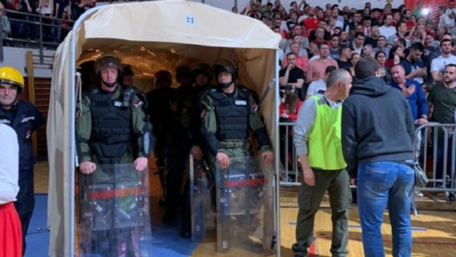 Ti navijači su seli iza i pored klupe gostujućeg tima, a Podgoričani su tražili da se prvih nekoliko redova na toj strani isprazni, tek kada je postavljeno obezbedjenje pored klupe, igrači podgoričkog tima su izašli ponovo na zagrevanje.
