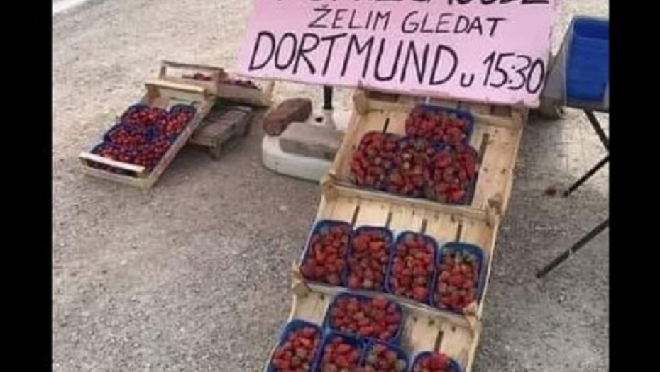 Koliko je fudbal najvažnija psoredna stvar na svetu dokazuje i fotka sa balkanskim drumova. Anonimni prodavac jagoda iz okoline Mostara je dovitljivom dosetkom želeo da rasproda jagode.