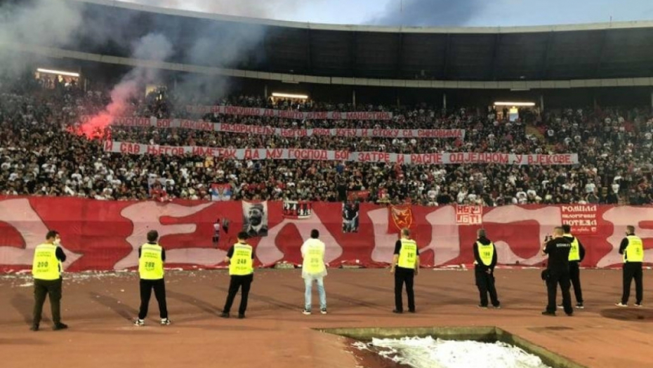 Na severnoj tribini stadiona "Rajko Mitić" se razvio transparent sa rečima nalik kletvi upućenim svima koji nameravaju da skrnave srpske svetinje: