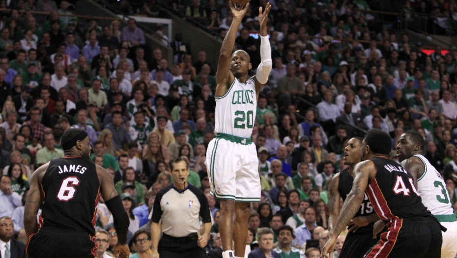 Seltiksi su tada formirali "Veliku trojku" pridružujući Alena i Kevina Garneta legendarnom Polu Pirsu. Već u prvoj sezoni stigli su do finala, a rival su bili Los Anđeles Lejkersi predvođeni Kobijem Brajantom. Boston je stigao do titule nakon šest mečeva, a poslednja utakmica u seriji završena je sa čak +39 za Seltikse. Rej je postigao sedam trojki i tako izjednačio rekord NBA lige po broju postignutih trojki u NBA finalu. Duel protiv Kobija shvatio je lično, s obzirom da se Brajant dosta puta potcenjivački izražavao o njemu tokom perioda u Sijetlu. Nakon dve godine, u reprizi tadašnjeg finala, Brajant nije dozvolio sebi novi poraz i revanširao se Bostonu. Tada su krenuli problemi za "Kelte". Počele su priče o ignorisanju Alena od strane Ronda, što je potvrdio i sam Alen nakon razgovora sa trenerom Dokom Riversom. To je bio okidač za Reja da ne produži ugovor i napusti Boston.