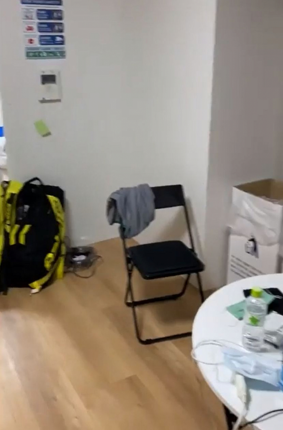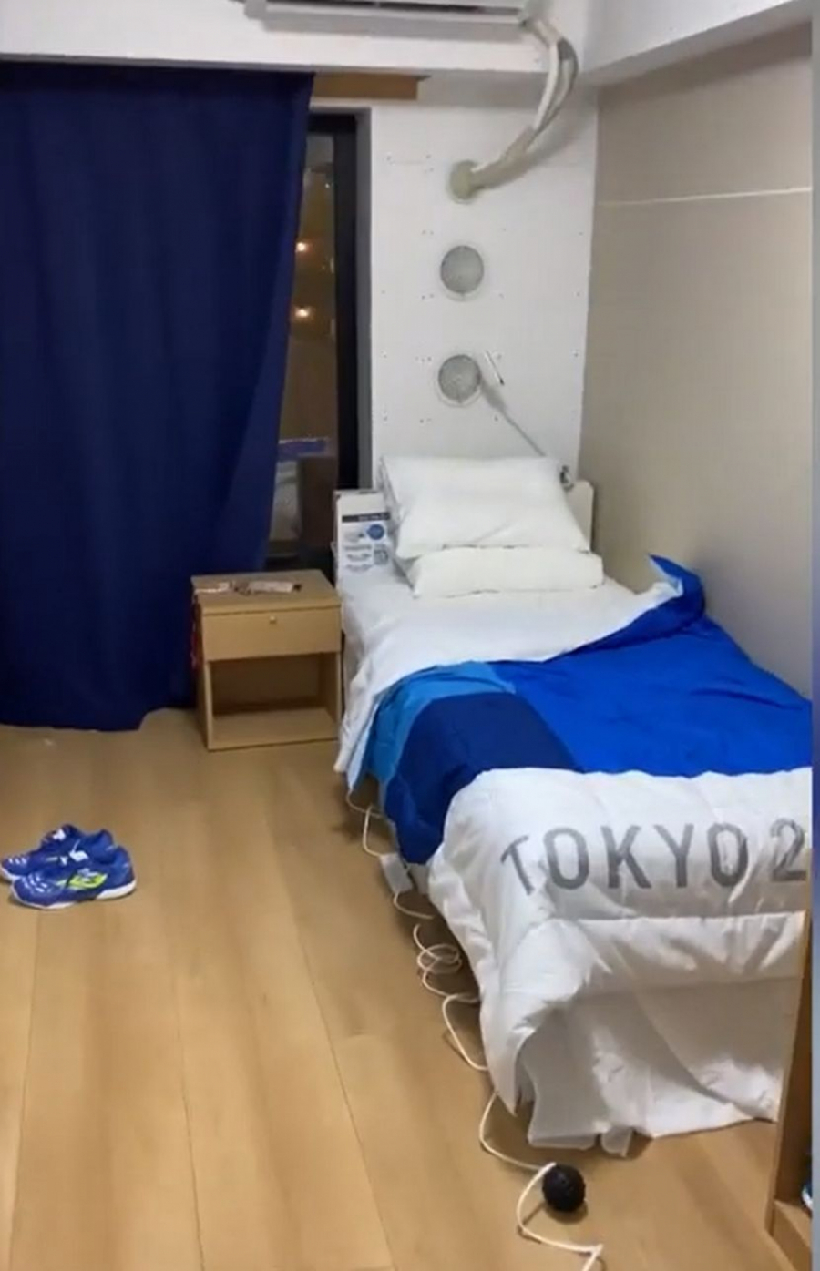 Kartonski krevet, pregradni zidovi od šperploče, mali prostor za odmor i oporavak.
