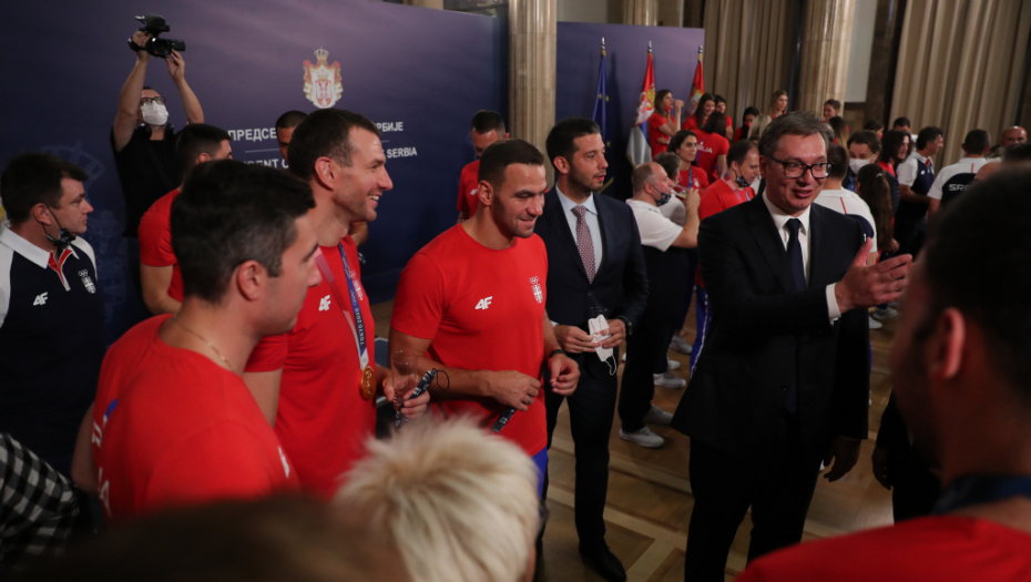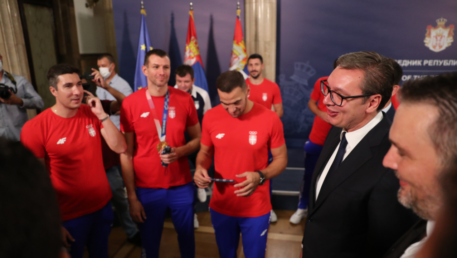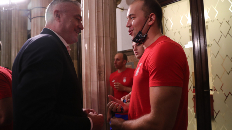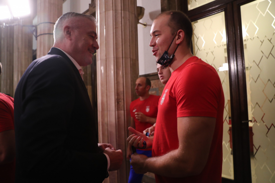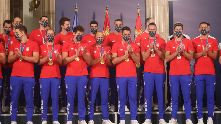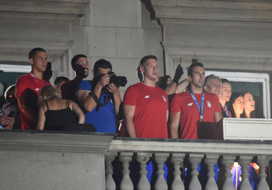 Došao je red na vaterpolo reprezentaciju Srbije. Delirijum među navijačima, redom su izašli Đorđe Lazić, Nikola Dedović, Strahinja Rašović, Nikola Jakšić, Sava Ranđelović, Dušan Mandić, Branislav Mitrović, Stefan Mitrović, Duško Pijetlović, Gojko Pijetlović, Andrija Prlainović, Milan Aleksić, Filip Filipović i selektor Dejan Savić.