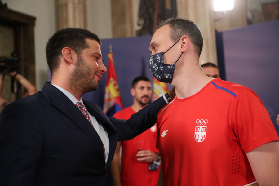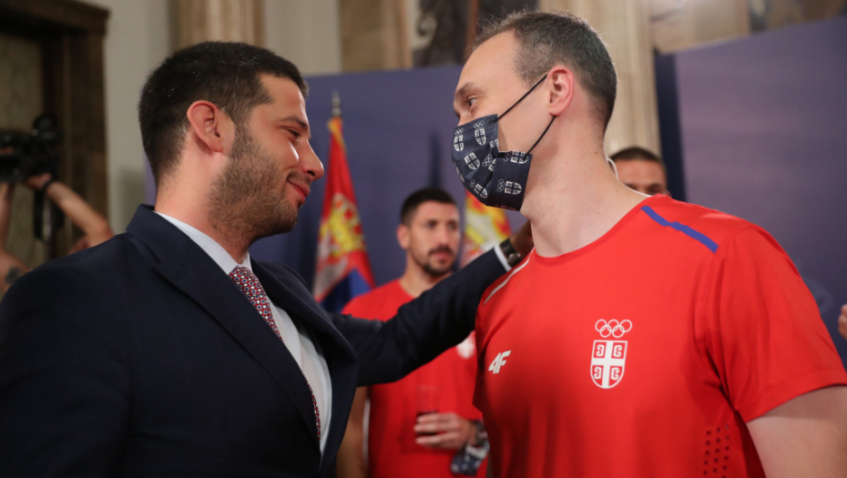 Odmah posle rvača, izašli su bronzani basketaši! Selektor Goran Vojkić i igrači Mihailo Vasić, Aleksa Ratkov i Dejan Majstorović, dok je poslat i pozdrav Dušanu Domoviću Bulutu koji je sa Olimpijskih igara otišao u SAD.
