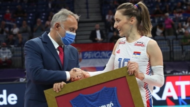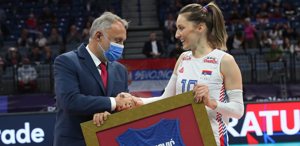 Zoran Gajić, predsednik OSS, uručio je Maji Ognjenović, kapitenu ženske seniorske reprezentacije Srbije, poklon povodom 300. utakmice u dresu sa nacionalnim grbom.