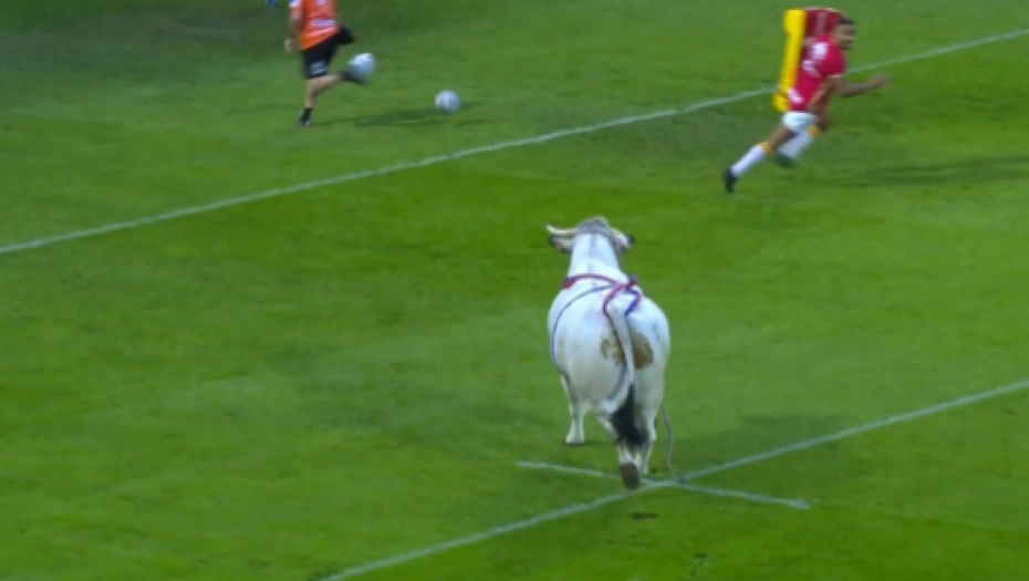 SPREČEN VEĆI INCIDENT Bik uleteo u teren pred početak utakmice i napao igrače (VIDEO)