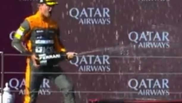 Noris je udario dnom boce šampanjca o podijum na kome se nalazio i Ferstapenov trofej, nakon čega je to puklo na paramparčad, što britanski vozač nije ni primetio u prvi mah.