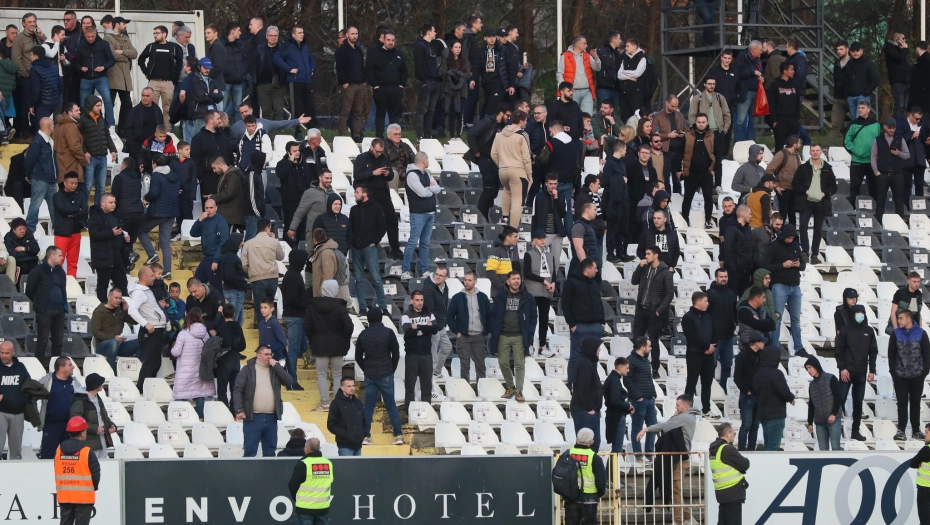Prekid! Sudija Milan Mitić povukao je ekipe sa terena i poslao ih u svlačionicu, a odluka je da žandarmerija isprazni deo tribine gde su navijači Partizana