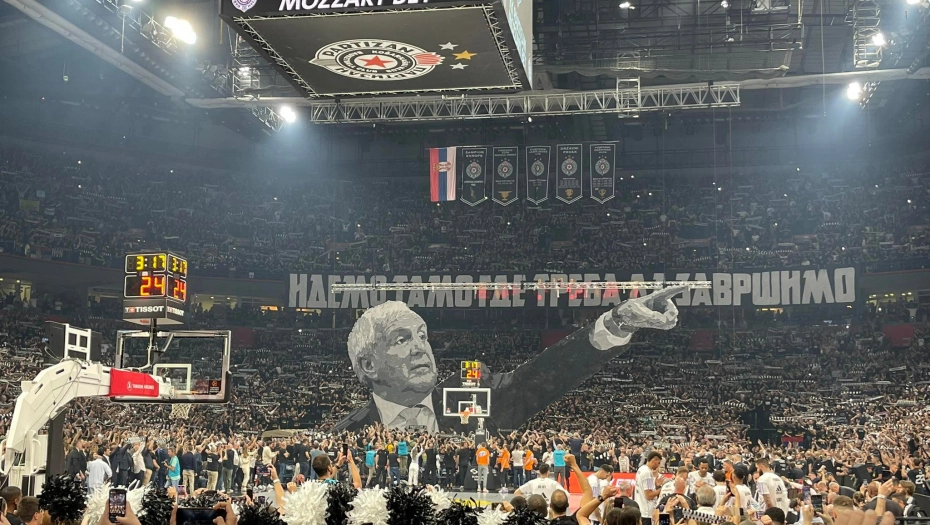 Velika šetalica sa likom Željka Obradovića i natpis "Idemo tamo gde treba da završimo".