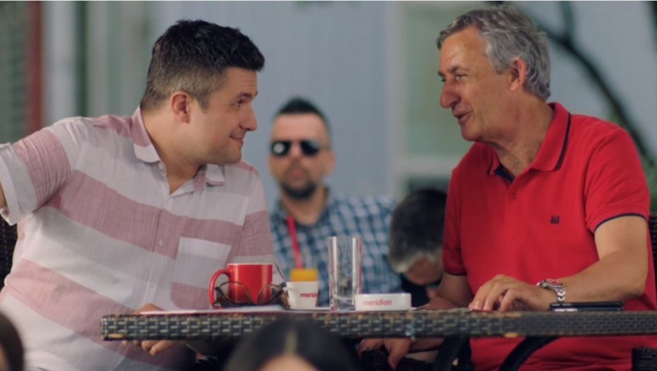 - Iz svlačionice za tri poena, ideeee - uzvikuje komentator Edin Avdić u reklamnom spotu, a Pešić pogađa i "preko ruke" u svom stilu. I njihovo neobavezno ćaskanje pokazuje onaj šmek borbe ispod obruča...