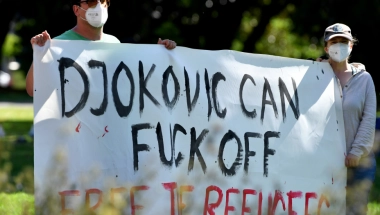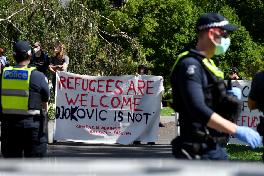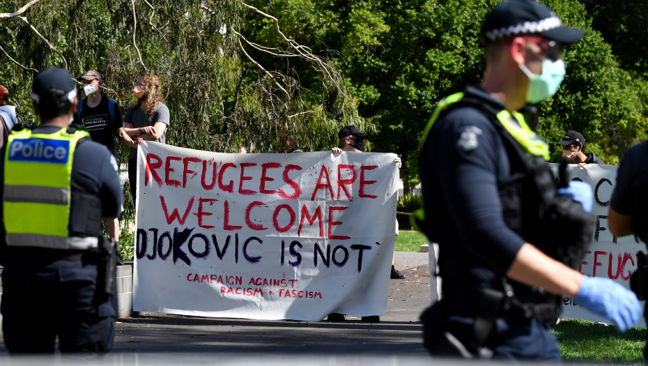 Tako su na transparentima istakli poruke :"Izbeglice su dobrodošle, Đoković nije" "Đoković može da odj*be, oslobodite izbeglice" i "Da li ćete da zaboravite naše prijatelje kada Đoković ode svojim privatnim avionom?"